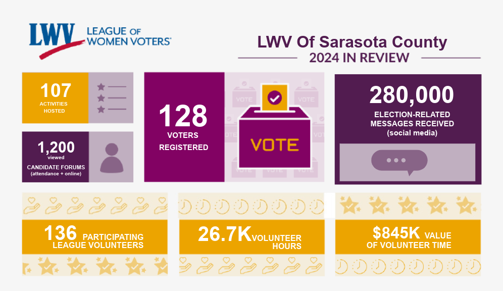 The League of Women Voters of Sarasota County is an advocacy group organized as a 501(c)(4) entity. Your donation will be used to support non-partisan advocacy actions. Advocacy donations are not tax-deductible.